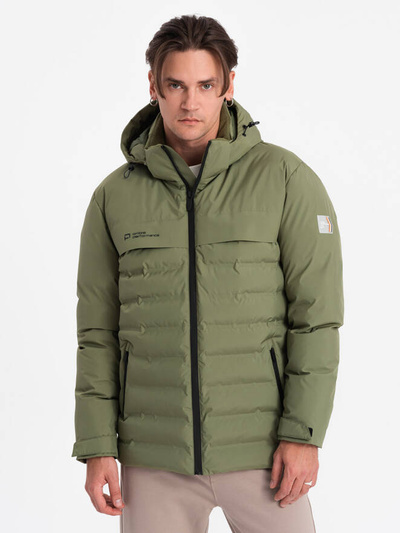 Men's quilted winter jacket with combined materials - dark olive green V3 OM-JAHP-0145